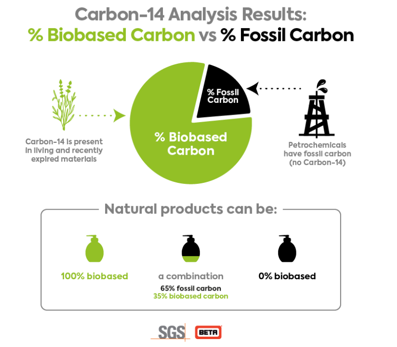 ISO 16620-2 does not differentiate whether the natural product is sourced from specific plants, animals, or microbiological materials. It is not a content specification analysis. The ISO 16620-2 report shows the percentage of a product that comes from natural sources (biobased content) versus synthetic petroleum-derived content.